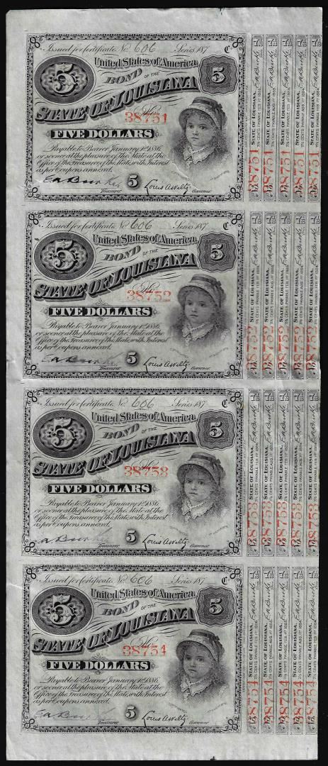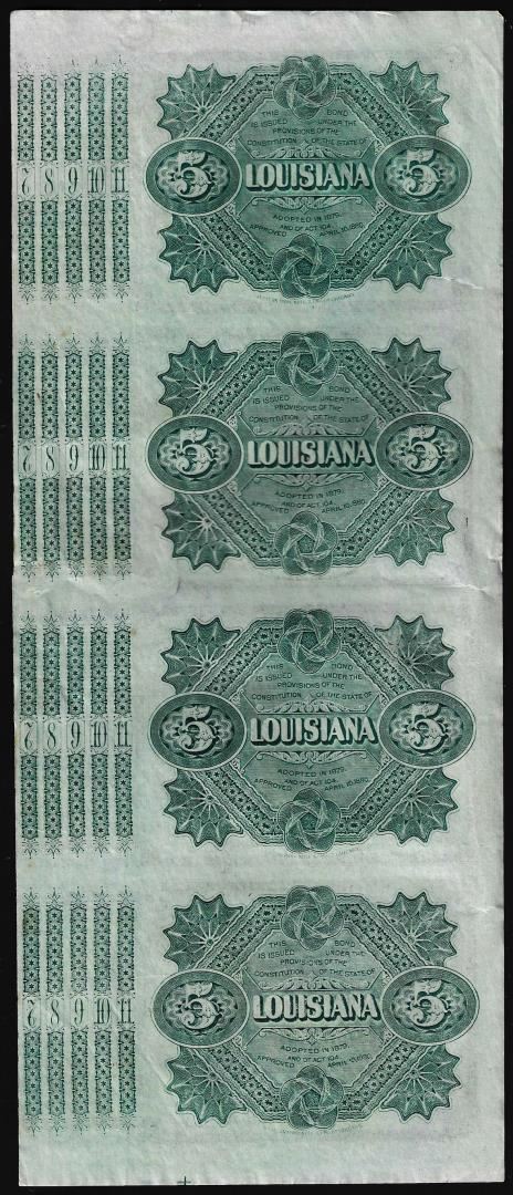 Uncut Sheet of (4) State of Louisiana Baby Bond Obsolete Notes