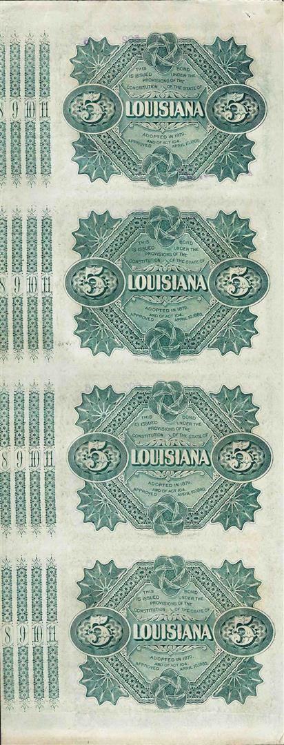 Uncut Sheet of (4) State of Louisiana Baby Bond Obsolete Notes