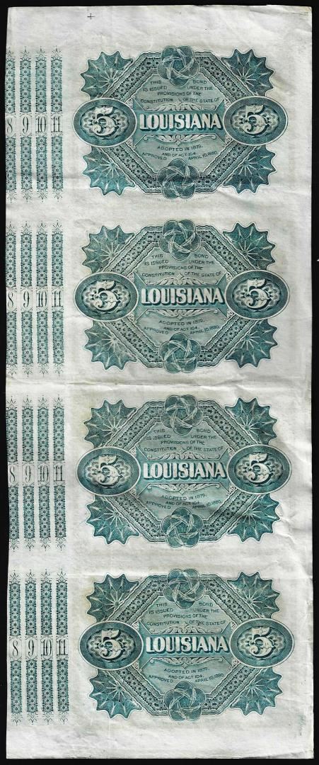 Uncut Sheet of (4) State of Louisiana Baby Bond Obsolete Notes