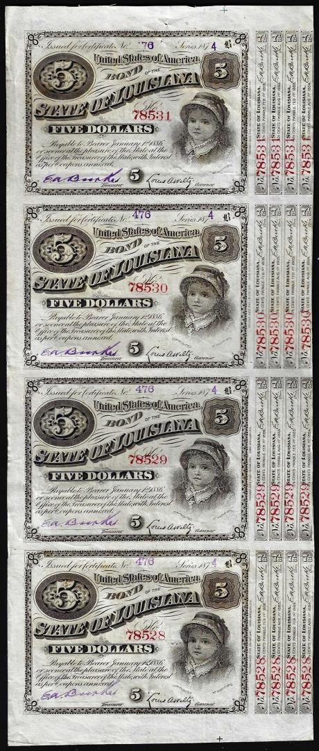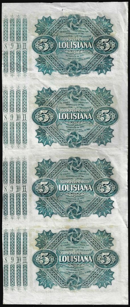 Uncut Sheet of (4) State of Louisiana Baby Bond Obsolete Notes