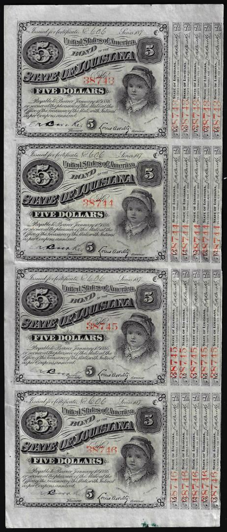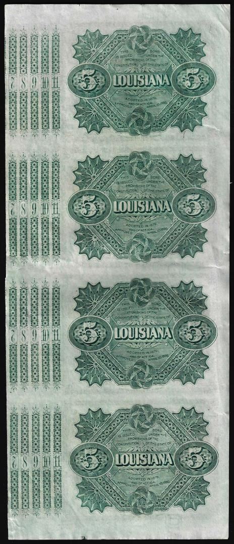 One Uncut Sheet of (4) State of Louisiana Baby Bond Obsolete Notes.