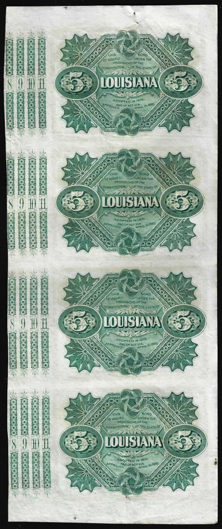 Uncut Sheet of (4) State of Louisiana Baby Bond Obsolete Notes