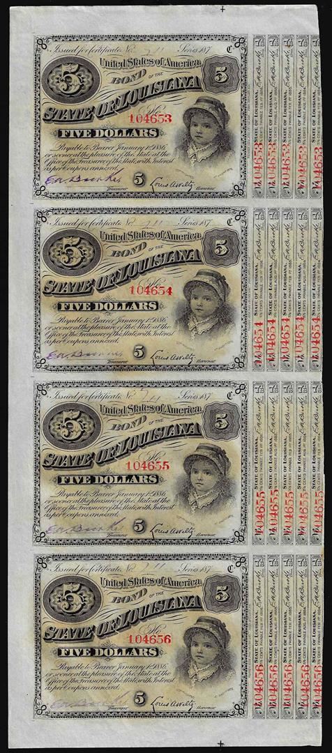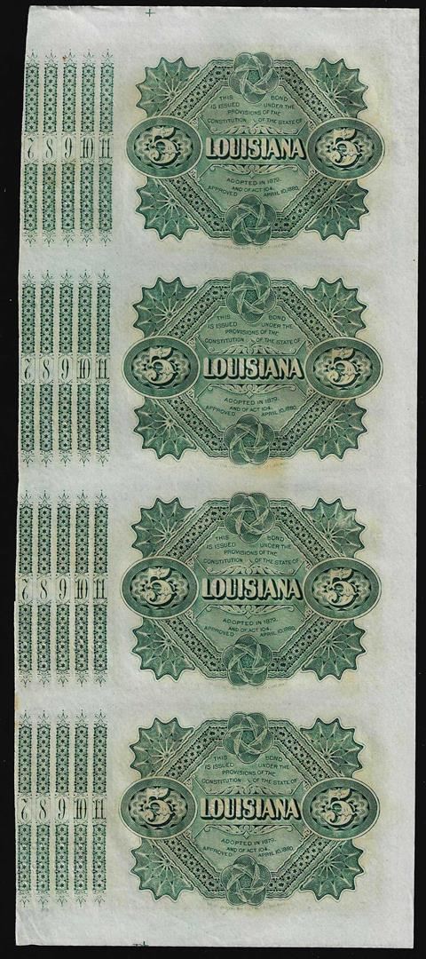 Uncut Sheet of (4) State of Louisiana Baby Bond Obsolete Notes