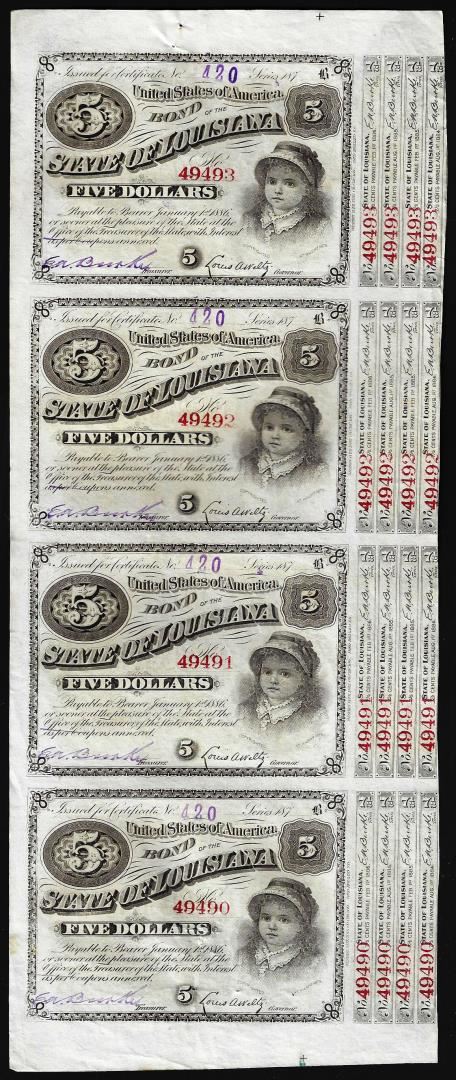 One Uncut Sheet of (4) State of Louisiana Baby Bond Obsolete Notes.