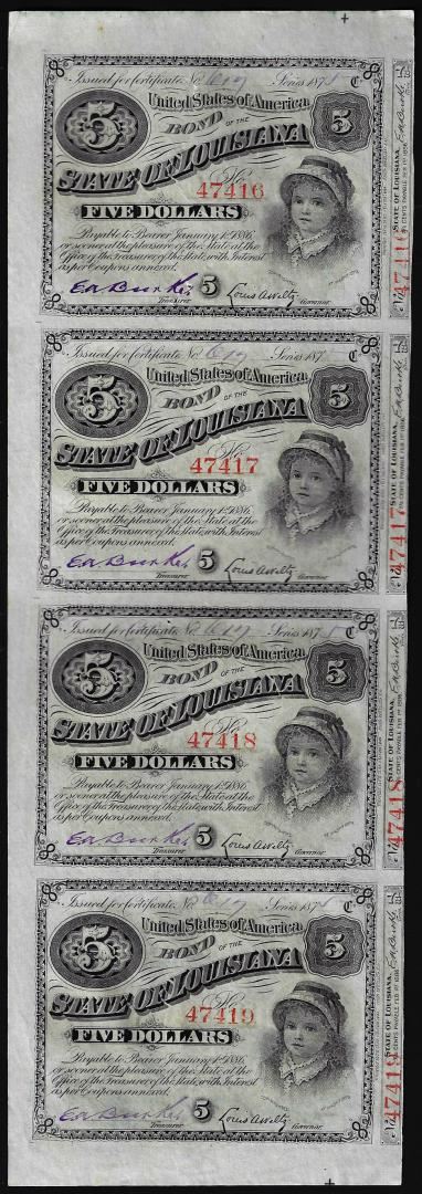 Uncut Sheet of (4) State of Louisiana Baby Bond Obsolete Notes
