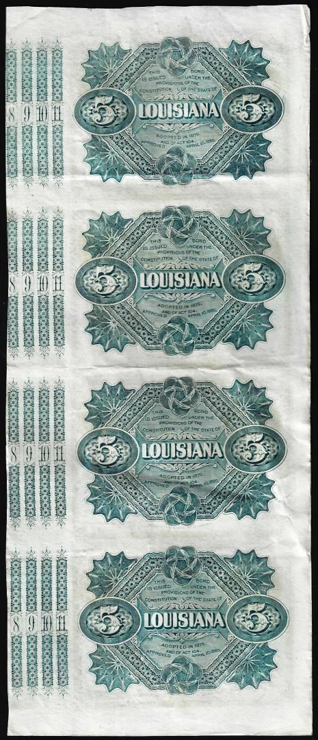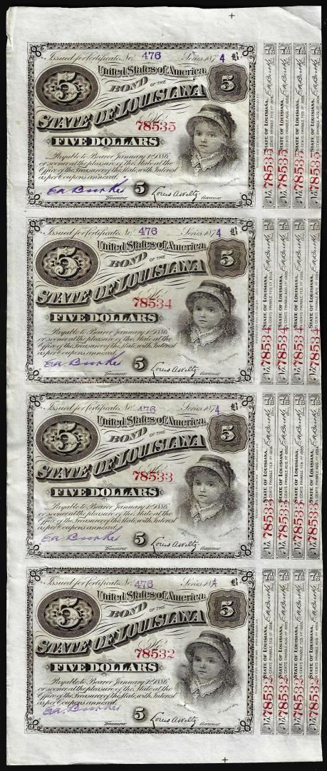 Uncut Sheet of (4) State of Louisiana Baby Bond Obsolete Notes