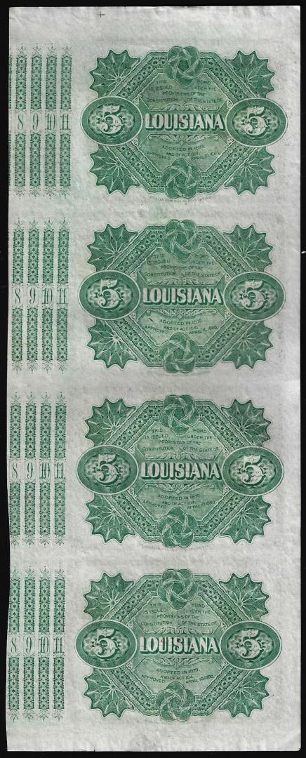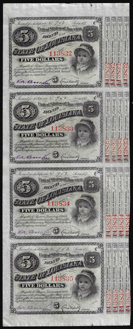 Uncut Sheet of (4) State of Louisiana Baby Bond Obsolete Notes