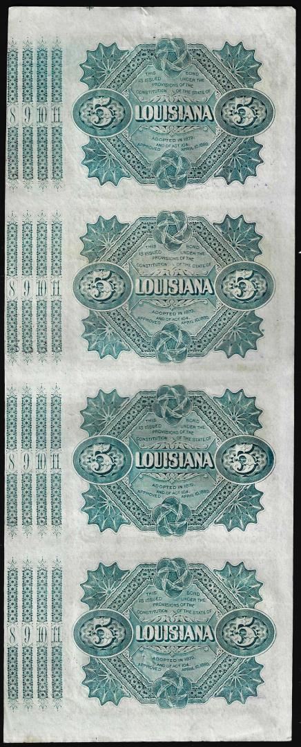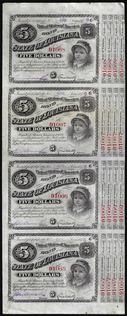 Uncut Sheet of (4) State of Louisiana Baby Bond Obsolete Notes