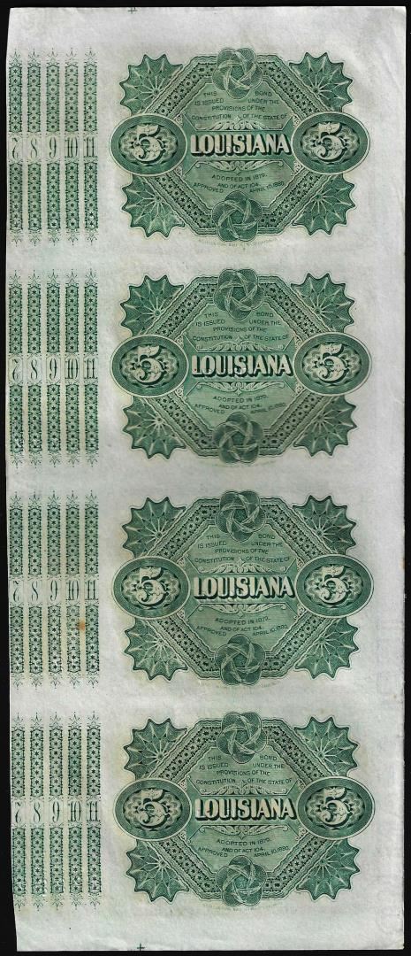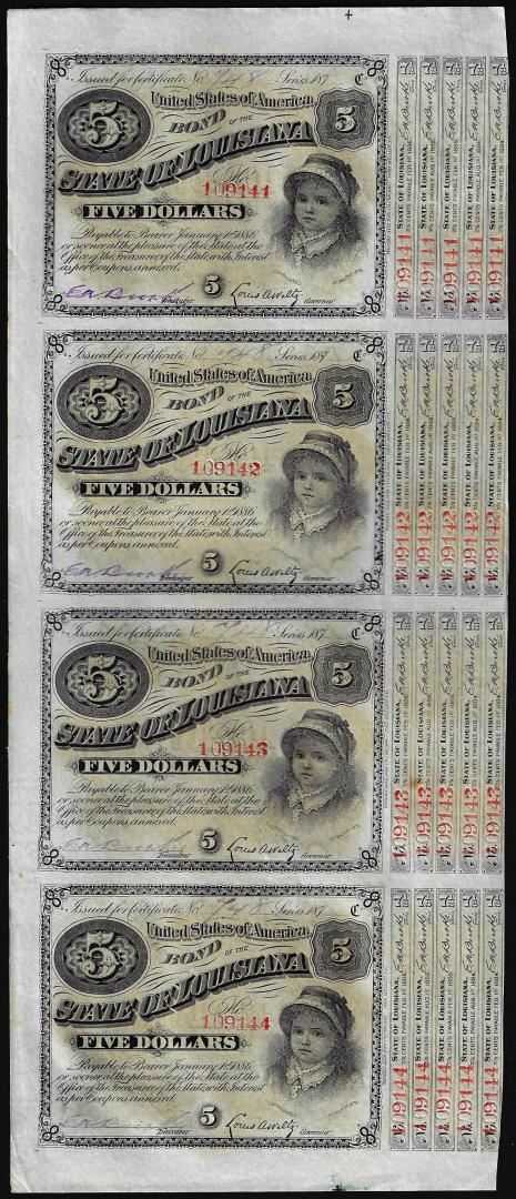 Uncut Sheet of (4) State of Louisiana Baby Bond Obsolete Notes