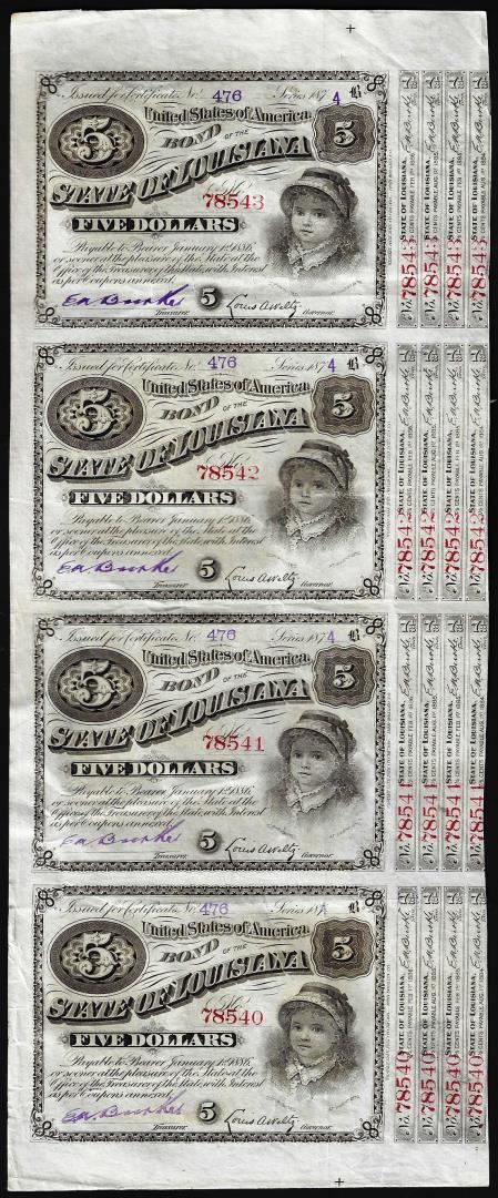 Uncut Sheet of (4) State of Louisiana Baby Bond Obsolete Notes