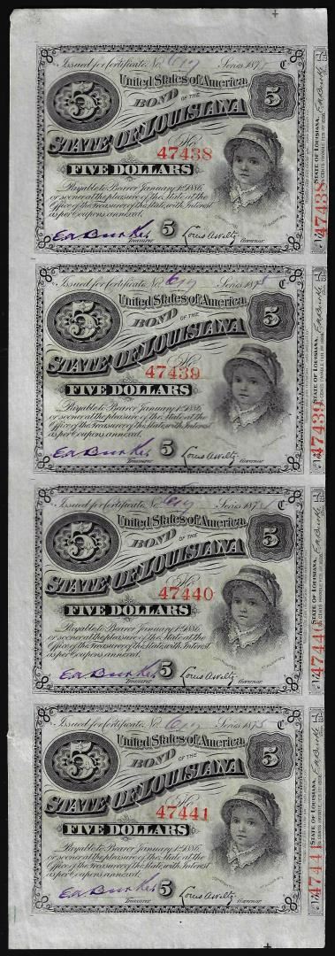 Uncut Sheet of (4) State of Louisiana Baby Bond Obsolete Notes