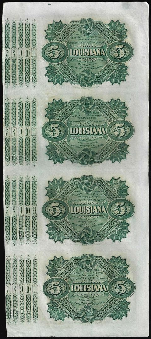 Uncut Sheet of (4) State of Louisiana Baby Bond Obsolete Notes