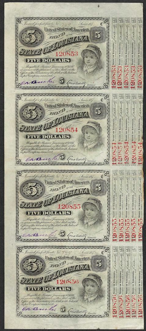 Uncut Sheet of (4) State of Louisiana Baby Bond Obsolete Notes