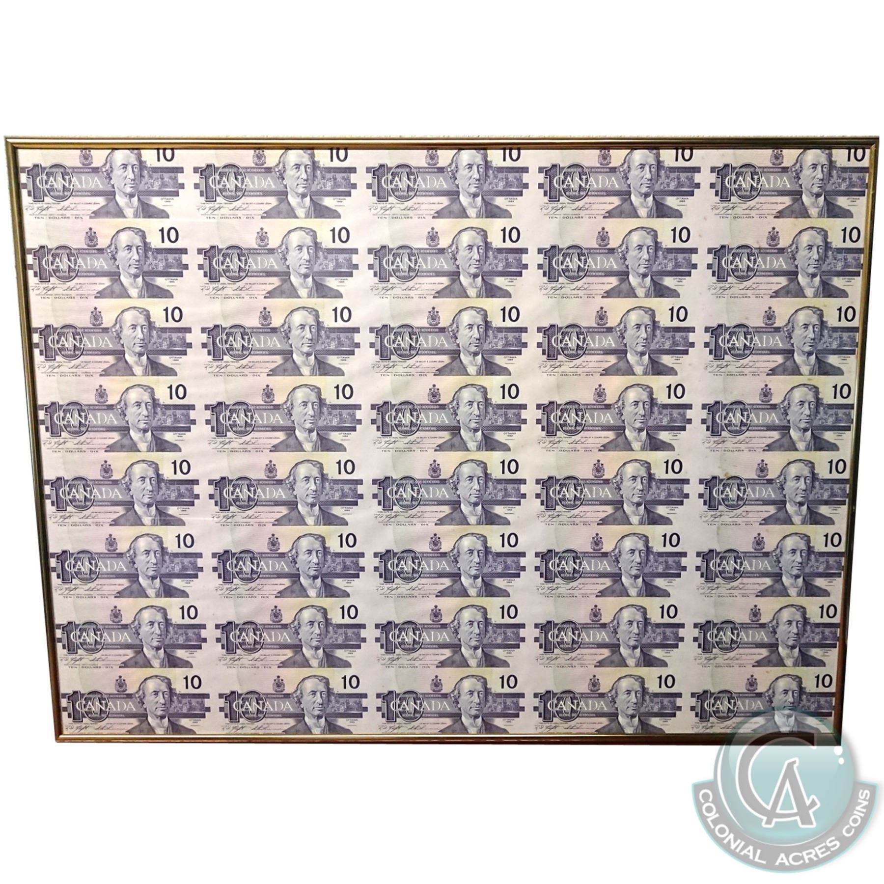 Uncut Sheet of 40 1989 $10; 5 x 8 format, Knight-Thiessen BEH Prefix. These sheets are becoming more rare in today's market and seldom offered for sale. This sheet has been properly mounted into a frame that is designed to protect the sheet from damage and can be removed intact. AU+
