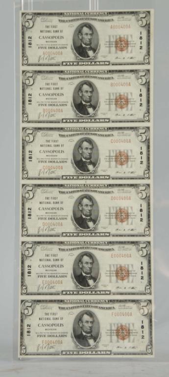 First National Bank of Cassopolis, Michigan. Includes "A" through "F" of serial numbers "000400A". Charter number "1812" series of 1929. Lovely uncut sheet in strong overall condition with no folds and only miniscule soiling or marks. (8.5, Excellent). Currency