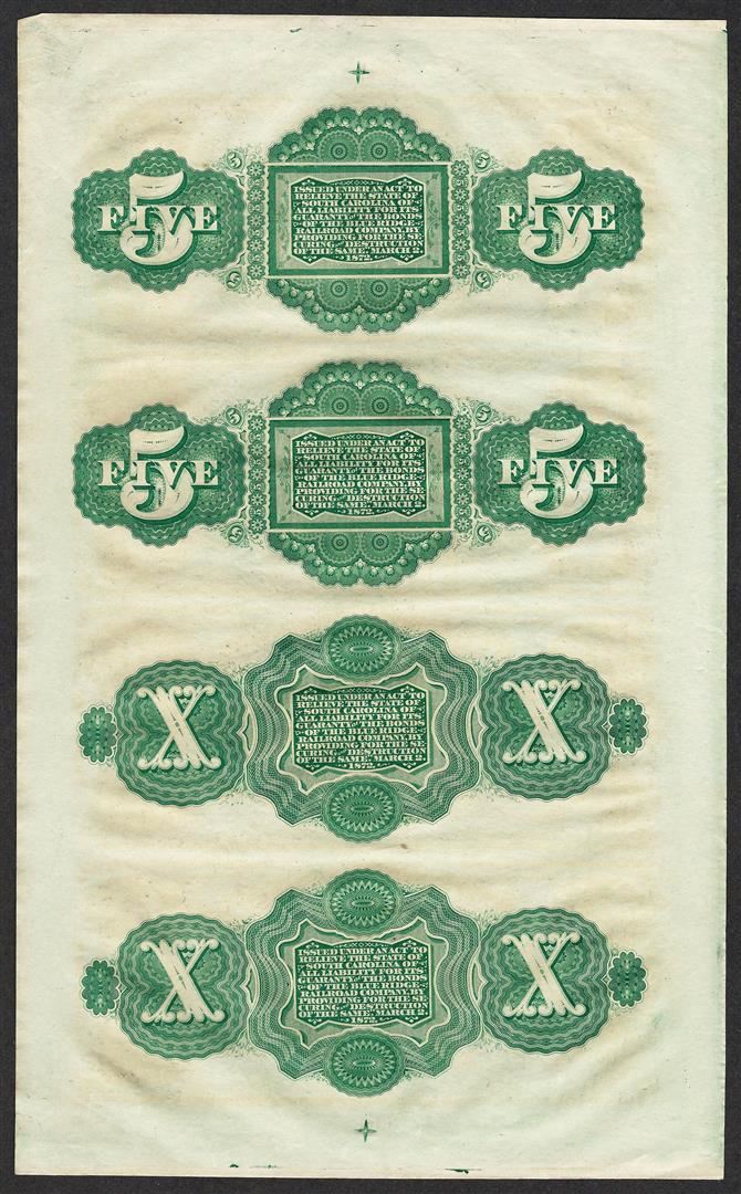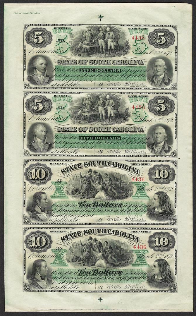 One Uncut Sheet of $5/$5/$10/$10 State of South Carolina Obsolete Notes.