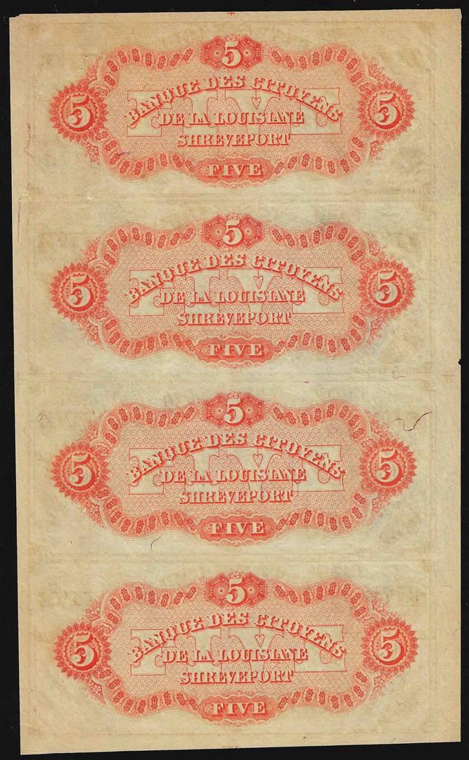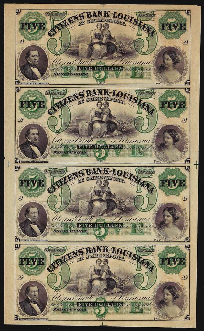 One Uncut Sheet of $5 Citizens Bank of Louisiana Obsolete Notes.