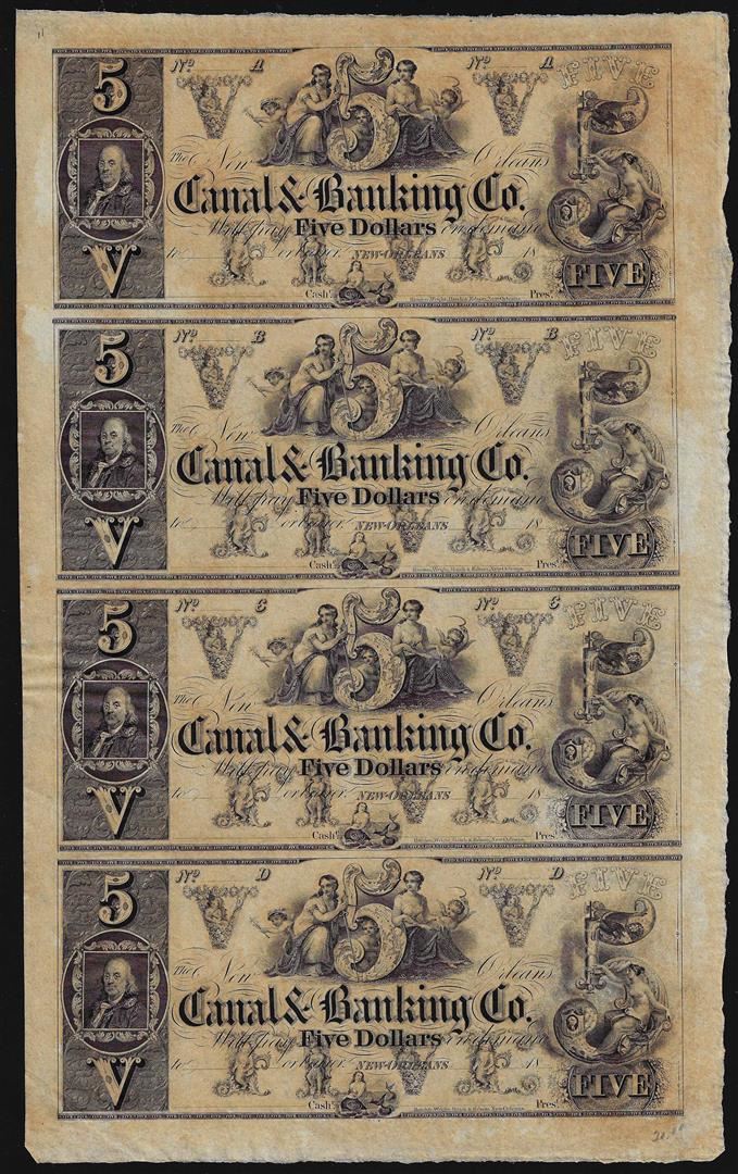 One Uncut Sheet of $5 New Orleans Canal & Banking Obsolete Notes.