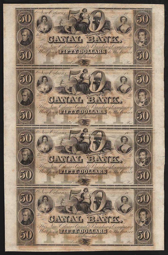 One Uncut Sheet of $50 Canal Bank New Orleans Obsolete Notes.