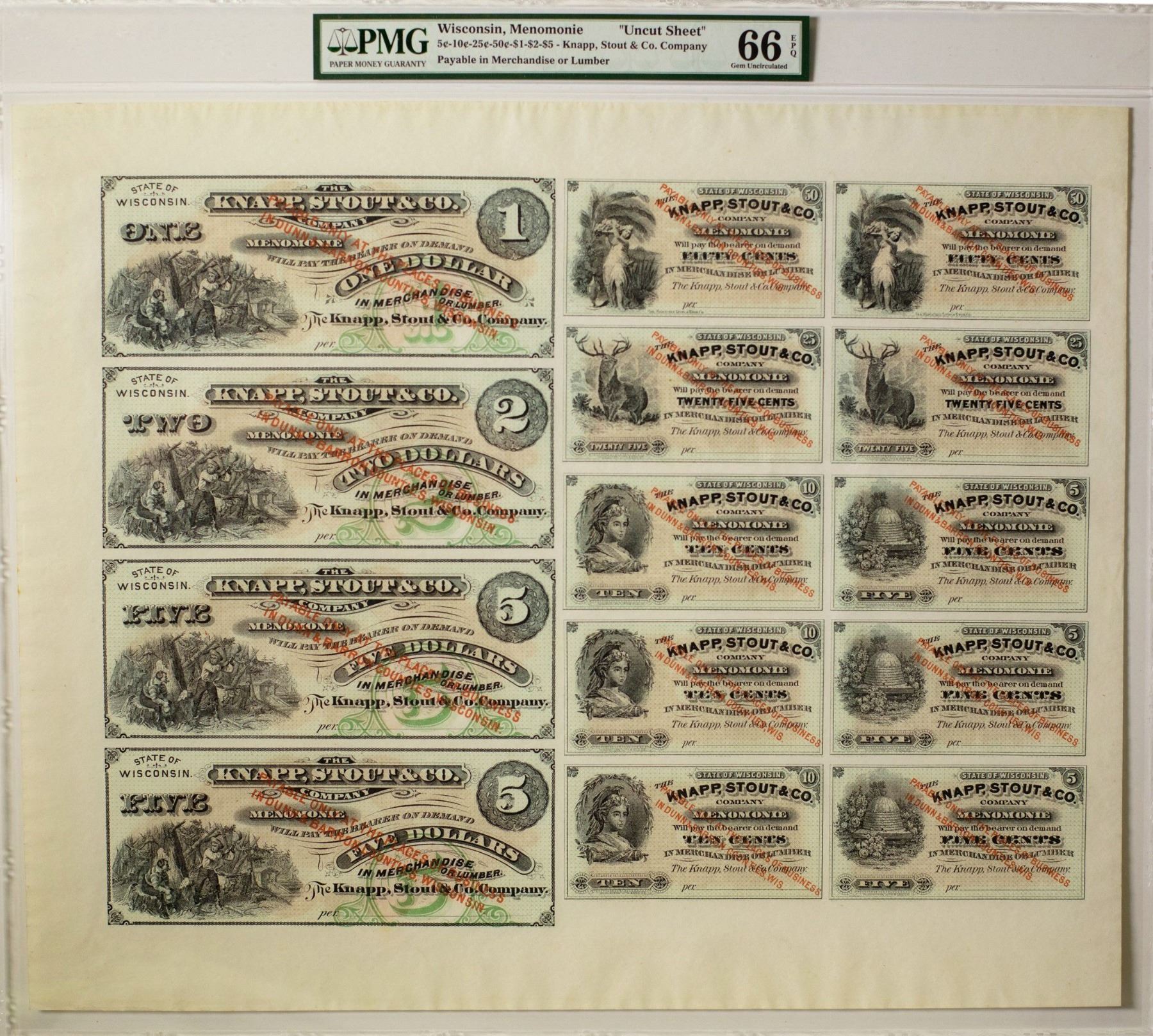 One Uncut Sheet of Knapp, Stout & Co Menomonie, WI Obsolete Notes PMG Gem Uncirculated 66EPQ.