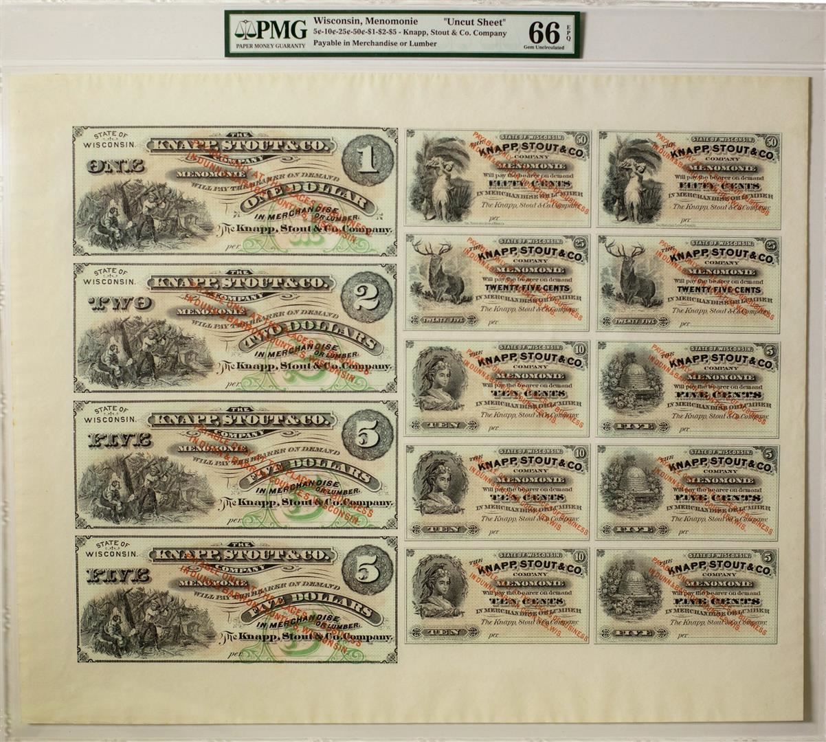 One Uncut Sheet of Knapp, Stout & Co Menomonie, WI Obsolete Notes PMG Gem Uncirculated 66EPQ. PMG Certified.
