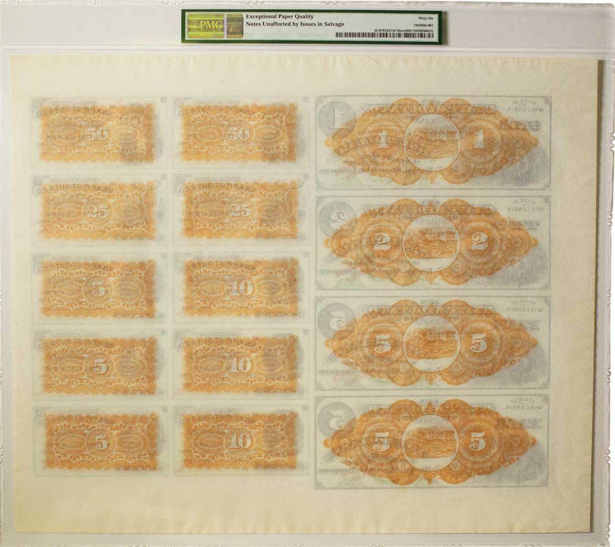 Uncut Sheet of Knapp, Stout & Co Menomonie, WI Obsolete Notes PMG Gem Uncirculat