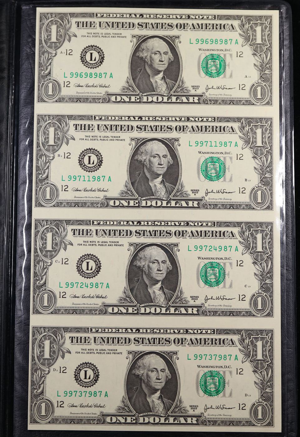 Uncut Uncirculated Sheet of 4x2003A $1 Bills in Folder w/ George Washington Portrait Grades Brilliant Uncirculated.