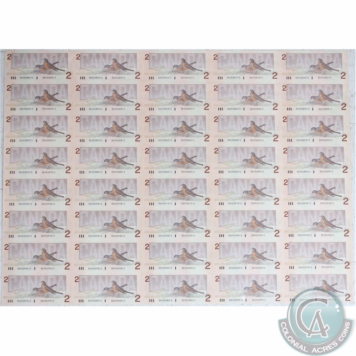 Uncut sheet of 40 x 1986 $2.00 notes, 5 x 8 format with BBU prefix. The sheet is in AU-UNC Condition