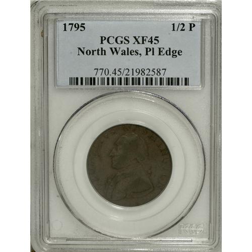 <B>Undated 1/2P Washington North Wales Halfpenny, Plain Edge XF45 PCGS.</B></I> Baker-34. "First Evasion" piece with single stars on either side of the harp at the bottom of the reverse. Light grayish-brown toning with deeper hues on the high points. The reverse has numerous wispy marks and a couple of rose spots. Listed on page 80 of the 2007 <I>Guide Book.</B></I> Population: 7 in 45, 6 finer (3/07).<BR><BR><b>Shipping:</b> Coins & Currency (<a target="_blank" href="http://www.heritageauctions.com/common/shipping.php">view shipping information</a>)
