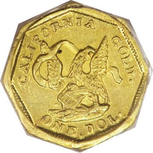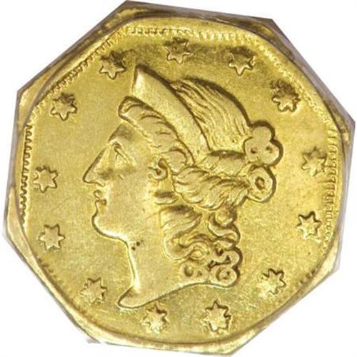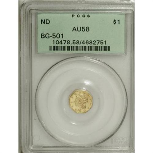 <B>Undated $1 Liberty Octagonal 1 Dollar, BG-501, Low R.5, AU58 PCGS.</B></I> A Frontier and Deviercy issue struck during the 1852-1856 period that is especially desirable because of the Humbert style reverse. This example shows only minimal signs of circulation, with considerable prooflike luster still in evidence. A couple of wispy pinscratches affect the lower portion of the obverse.<BR><BR><b>Shipping:</b> Coins & Currency (<a target="_blank" href="http://www.heritageauctions.com/common/shipping.php">view shipping information</a>)