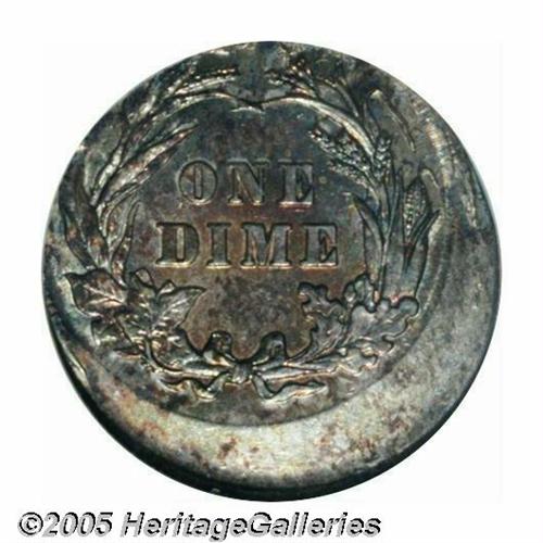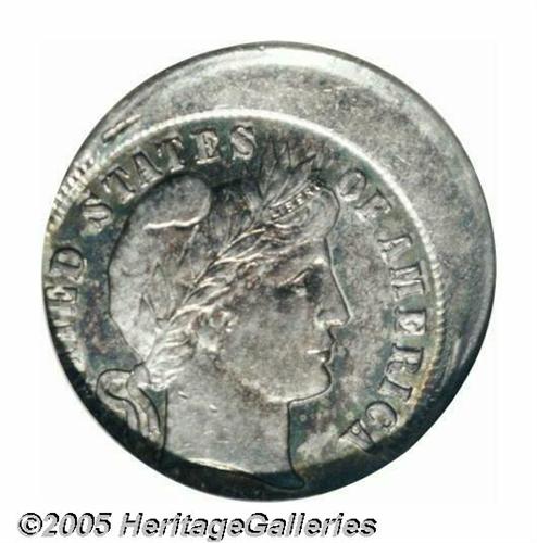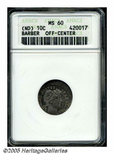 <B>Undated<10C> Barber Dime--Off Center--MS60 ANACS.</B></I> This Philadelphia Mint Dime is struck approximately 20% off center toward 7:30. Most of the date is absent, and the fragments present are significantly distorted, as made from metal flow to the rim during the strike. Attractively toned in sea-green, navy-blue, orange, mauve, and cream-gray colors.<BR><I>From The Larry Rausch Collection of Errors, Part Four.</B></I>