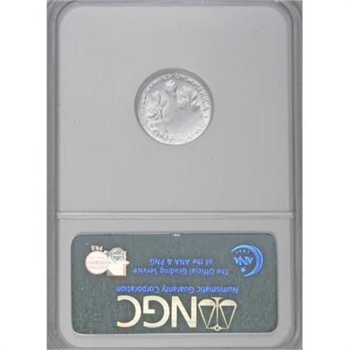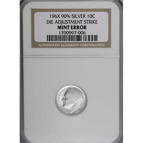 <B>196? Roosevelt Dime--Die Adjustment Strike--NGC.</B></I> A silver Roosevelt dime (1960s) die adjustment strike with partial design features visible on each side. Nearly full luster and a faint trace of wear suggest a grade of AU55 or so. A nearly full date is visible, including 196, although the final digit is extremely weak but looks like it could be a 1.<BR><BR><B>Coin Engraver:</B> John R. Sinnock<BR><BR><b>Shipping:</b> Coins & Currency (<a target="_blank" href="http://www.heritageauctions.com/common/shipping.php">view shipping information</a>)