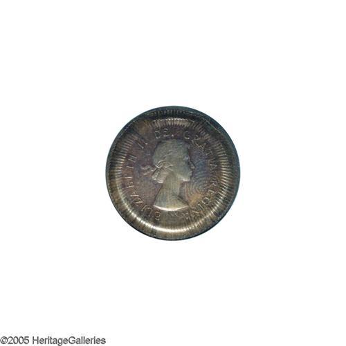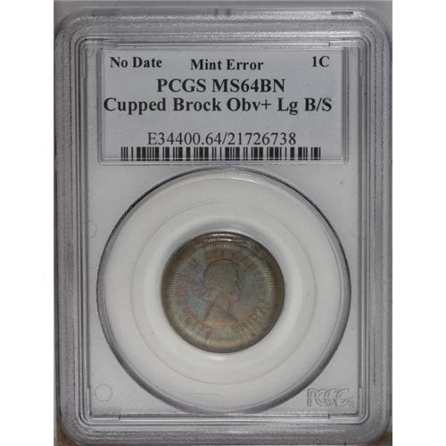 <B>Undated (1953 to 1964) With Strap Canadian Cent--Cupped Brockage Obverse and Large Broadstrike--MS64 PCGS.</B></I> KM-49. A Cent (not this piece) was normally struck but failed to eject from the dies. A newly fed planchet (which became this coin) was struck against the previously struck Cent (not included), which jammed the present piece onto the obverse die, and created a brockage portrait of the young queen on the reverse that expanded and blurred as the piece was subsequently struck against an unknown number of newly fed planchets. The Cent has a cupped appearance, since the edges wrapped around the obverse die. Toned in deep navy-blue, sea-green, and orange-red colors. A faint fingerprint is noted beneath the chin.<BR><I>From The Larry Rausch Collection of Errors, Part Seven.</B></I>