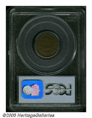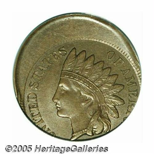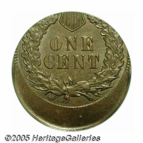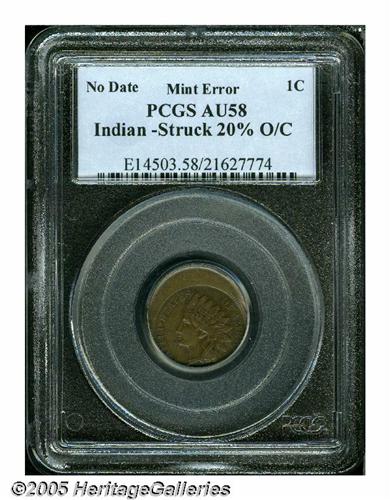 <B>Undated<1C> Indian Cent--Struck 20% Off Center--AU58 PCGS.</B></I> Struck off-center to the 6 o'clock position on the obverse, as expected, the date is also missing from this desirable error specimen. The extremely smooth surfaces exhibit attractive medium brown color.<BR><I>From The Larry Rausch Collection, Part Five.</B></I>