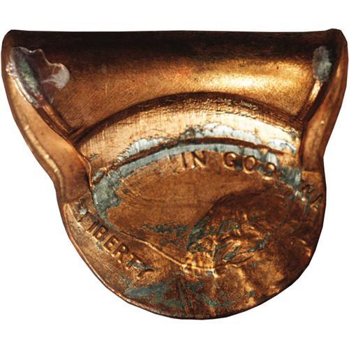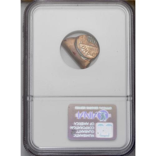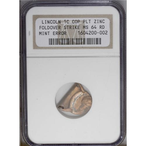 <B>Undated<1C> Lincoln Memorial Cent--Foldover Strike--MS64 Red NGC.</B></I> Copper-plated zinc (post-1982) alloy. The planchet was vertical, relative to the dies, at the moment of strike. The force of the strike bent the planchet across its center, and folded the two ends together. The upper left obverse quadrant and the lower left reverse quadrant are present, but the date and any mintmark are off the flan. Traces of the zinc interior are struck onto the coin, as made, and the highpoints of the seam were affixed to the interior of the holder during its sonic sealing.