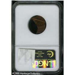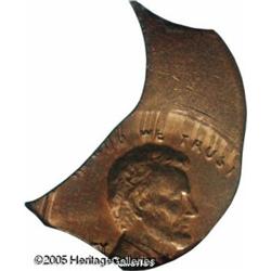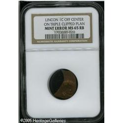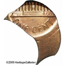 <B>Undated 1C Lincoln Memorial Cent--Off Center on Triple Clipped Planchet--MS65 Red and Brown NGC.</B></I> The crescent shaped flan was clipped three times, one major and two minor. Struck off center at about 5:30. The surfaces are nearly fully brilliant with light blue and violet color. A lovely Gem quality example and a dramatic error. Lot:10862