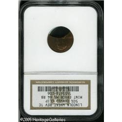 <B>Undated 1C Lincoln Wheat Cent--50% Curved Clip--MS64 Red and Brown NGC.</B></I> A curved clip affects the lower obverse, and causes the absence of the date, mintmark, and any VDB initials beneath Lincoln's shoulder. A lustrous and unmarked piece with some toning flecks. Lot:10838