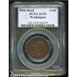 Undated 1C Washington Double Head Cent AU53 PCGS. Baker-6. Breen-1204. Nice medium brown example of this popular token. Quite unusual in that the main device punch is identical on both sides; only the WASHINGTON and ONE CENT legends distinguish the two sides. A small old scratch in front of the face on the WASHINGTON side is the only problem, and a minor one at that. Listed on page 59 of the 2003 Guide Book. Important notice: Heritage usually auctions material at the rate of 200-250 lots per hour. On some occasions eBay Live bid software or the Internet may not be able to keep up with the pace of the auction. We recommend placing a realistic absentee bid now as insurance to avoid disappointment. Occasionally the auctioneer may eliminate or reject an eBay Live bid, and the auctioneer may also reopen a lot after the close of the eBay live bidding (usually because we missed an audience bid), and may reject your bid even if it shows you as the winning bidder. By bidding via eBay Live, you agree that Heritage may award the lot to another bidder at its sole discretion under the circumstances described above or any other reasonable circumstances. Also please note that all Heritage lots purchased through eBay Live carry a 20% Buyer's Premium. Please make sure you read the Terms and Conditions before you bid.