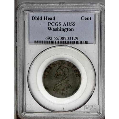 <B>Undated<1C> Washington Double Head Cent AU55 PCGS.</B></I> Baker-6, R.1. A crisply defined medium brown piece with clean surfaces on the WASHINGTON side and a few subdued pinscratches on the ONE CENT side. Listed on page 76 of the 2006 <I>Guide Book.</B></I> <BR><BR><B>Important notice:</B> Heritage usually auctions material at the rate of 200-250 lots per hour. On some occasions eBay Live bid software or the Internet may not be able to keep up with the pace of the auction. We recommend placing a realistic absentee bid now as insurance to avoid disappointment. Occasionally the auctioneer may eliminate or reject an eBay Live bid, and the auctioneer may also reopen a lot after the close of the eBay live bidding (usually because we missed an audience bid), and may reject your bid even if it shows you as the winning bidder. By bidding via eBay Live, you agree that Heritage may award the lot to another bidder at its sole discretion under the circumstances described above or any other reasonable circumstances. Since eBay bids are not shown to us until we open the lot on the floor, we treat those bids just like floor bids. In most cases the floor responds before the eBay bid is presented to us, due to Internet lag time, so for consistency we have made it a policy that floor bids are always considered first over tie eBay live bids. Also please note that all Heritage lots purchased through eBay Live carry a 20% Buyer's Premium. Please make sure you read the Terms and Conditions before you bid. This lot is being auctioned in conjunction with a live floor auction by Heritage Galleries & Auctioneers. All final auction and invoice information will be supplied by Heritage Galleries & Auctioneers, and all other information should be considered preliminary. Lot:191 <BR><BR><B>Winning Notification and Billing:</B> After the FINAL session in this auction is complete, Heritage will send e-mail and snail mail invoices. This process normally takes several days. All final auction and invoice information will be supplied by Heritage Galleries & Auctioneers, and all other information should be considered preliminary. <BR><BR>This auction will be conducted on a live auction floor and over the Internet through eBay Live. If you choose to place an absentee bid, please take a moment to <font color='#0000ff'><u><a href='http://pages.ebay.com/liveauctions/help/before/laabsentee.html'>learn how eBay Live absentee bidding works</a></u></font><font color='#000000'>