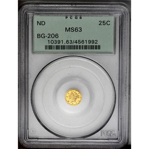 <B>Undated<25C> Liberty Round 25 Cents, BG-206, High R.4, MS63 PCGS.</B></I> An intricately struck canary-gold Period One piece with a mint-made mattelike appearance. Carefully preserved, and encased in a green label holder. Population: 15 in 63, 9 finer (5/06).