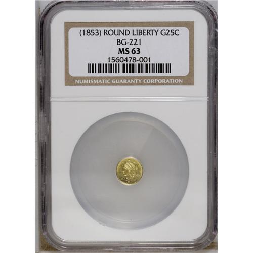 <B>Undated 25C Liberty Round 25 Cents, BG-221, R.3, MS63 NGC.</B></I> This sharply struck and smooth green-gold piece has the initial appearance of a finer grade, but the central reverse is slightly wavy. Census: 6 in 63, 2 finer (12/06).<BR><BR><b>Shipping:</b> Coins & Currency (<a target="_blank" href="http://www.heritageauctions.com/common/shipping.php">view shipping information</a>)