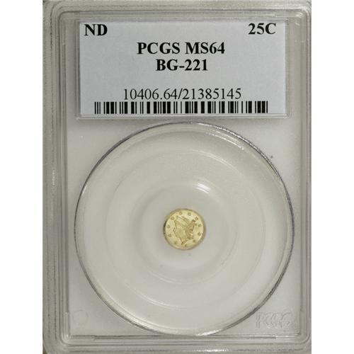 <B>Undated 25C Liberty Round 25 Cents, BG-221, R.3, MS64 PCGS.</B></I> PCGS Population (34/2). NGC Census: (2/2). (#10406)<BR><BR><b>Shipping:</b> Coins & Currency (<a target="_blank" href="http://www.heritageauctions.com/common/shipping.php">view shipping information</a>)