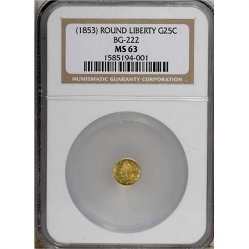 <B>Undated 25C Liberty Round 25 Cents, BG-222, R.2, MS63 NGC.</B></I> NGC Census: (12/18). PCGS Population (104/111). (#10407)<BR><BR><b>Shipping:</b> Coins & Currency (<a target="_blank" href="http://www.heritageauctions.com/common/shipping.php">view shipping information</a>)