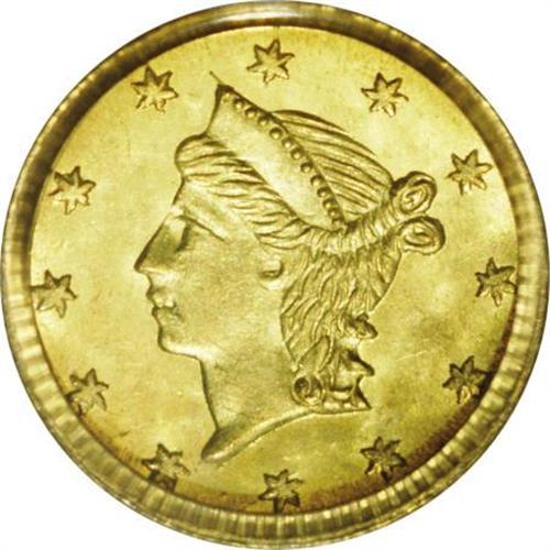 <B>Undated<25C> Liberty Round 25 Cents, BG-222, R.2, MS65 PCGS.</B></I> This is a gorgeous prooflike Gem with brilliant yellow color and noticeable cameo contrast. A splendid example. Slightly dished as always.