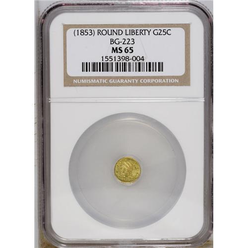 <B>Undated 25C Liberty Round 25 Cents, BG-223, Low R.4, MS65 NGC.</B></I> The single finest representative certified by NGC (12/06). The lustrous, slightly hazy surfaces of this Gem are tinged with olive.<BR><BR><b>Shipping:</b> Coin/Currency (<a target="_blank" href="http://www.heritageauctions.com/common/shipping.php">view shipping information</a>)