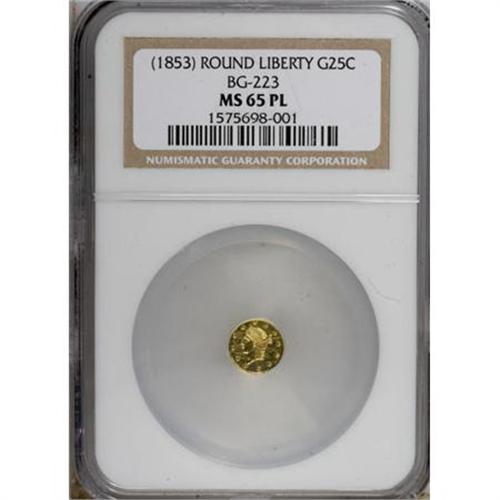 <B>Undated 25C Liberty Round 25 Cents, BG-223, Low R.4, MS65 Prooflike NGC.</B></I> Bright yellow-gold surfaces yield pleasing field-motif contrast, and are well preserved. Sharply struck, with die polish lines in the obverse fields. Die State I, confirmed by the lowest inner left berry being visible though weak. Census: 1 in 65 Prooflike, 0 finer (7/07).<BR><BR><b>Shipping:</b> Coins & Currency (<a target="_blank" href="http://www.heritageauctions.com/common/shipping.php">view shipping information</a>)