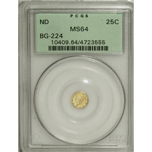 <B>Undated 25C Liberty Round 25 Cents, BG-224, R.3, MS64 PCGS.</B></I> A charming Period One piece that boasts lustrous, clean surfaces and a penetrating strike. The engraver likely had no access to numeral punches, which explains the crude appearance of the denominator.<BR><I>From The Vanek Collection.</B></I><BR><BR><b>Shipping:</b> Coins & Currency (<a target="_blank" href="http://www.heritageauctions.com/common/shipping.php">view shipping information</a>)