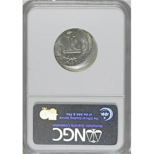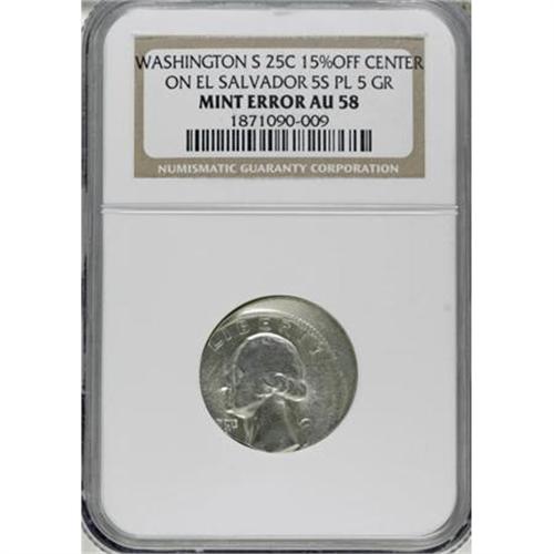 <B>Undated 25C S-Mint Washington Quarter--15% Off Center on El Salvador 5C Planchet--AU58 NGC.</B></I> Struck 15% off-center at 8 o'clock. A trace of wear is visible on the highpoints of the design. Issued at the San Francisco Mint, with the S mintmark prominent on the reverse. The United States Mint issued 5 centavo coins for El Salvador in 1940, 1944, 1948, and 1950 through 1953.<BR><BR><B>Coin Engraver:</B> John Flanagan<BR><BR><b>Shipping:</b> Coins & Currency (<a target="_blank" href="http://www.heritageauctions.com/common/shipping.php">view shipping information</a>)