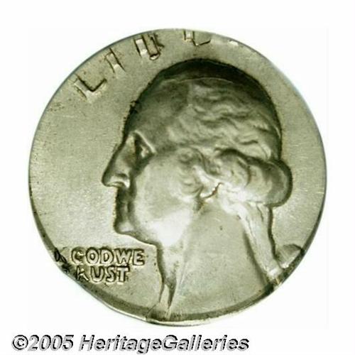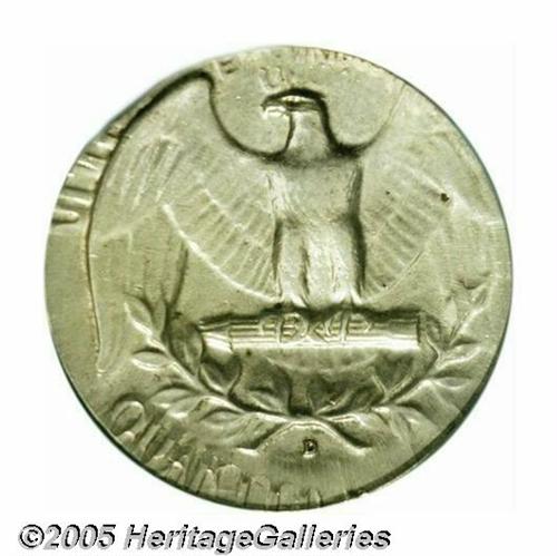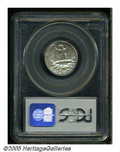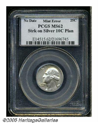 <B>Undated<25C> Washington Quarter--Struck on Silver Dime Planchet--MS62 PCGS.</B></I> All of Washington's head and most of the eagle's design, along with the wreath and mintmark, are present and sharply struck. A typical die crack (as struck) traverses Washington's scalp. A few small toning specks are seen, but the piece seems essentially untoned and unblemished, on both sides.