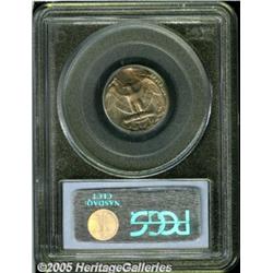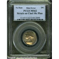 <B>Undated 25C Washington Quarter--Struck on a Clad Dime Planchet--MS62 PCGS.</B></I> Fairly well centered, the date is not visible but the D mintmark is. Golden and lilac toning is seen on each side with a couple of more obvious marks on the obverse.